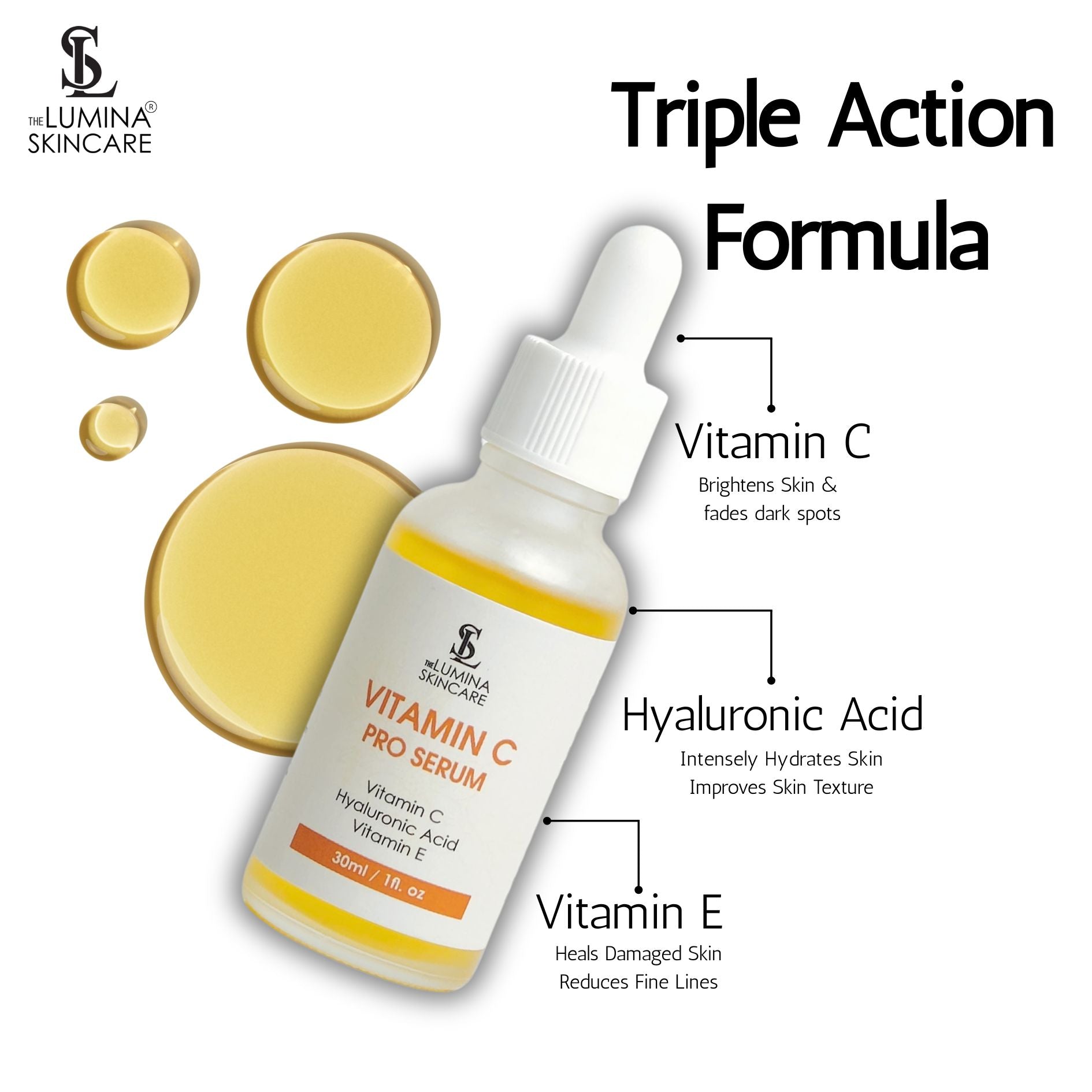 Elevate your skincare routine with the luxurious Vitamin C Pro Serum. Infused with potent Vitamin C, Hyaluronic Acid, and Vitamin E, this advanced formula brightens dull skin, deeply hydrates, and protects against environmental stressors, let your skin glow with timeless elegance.